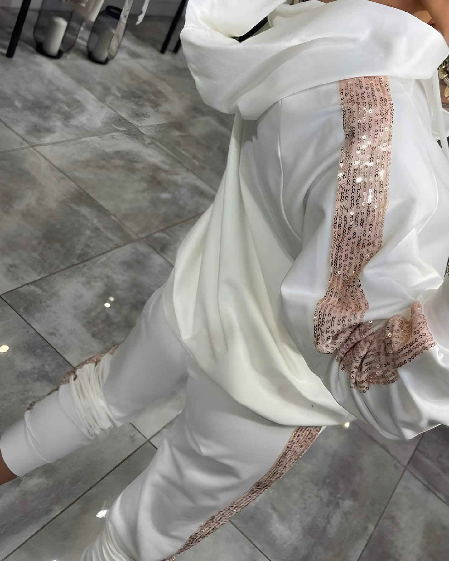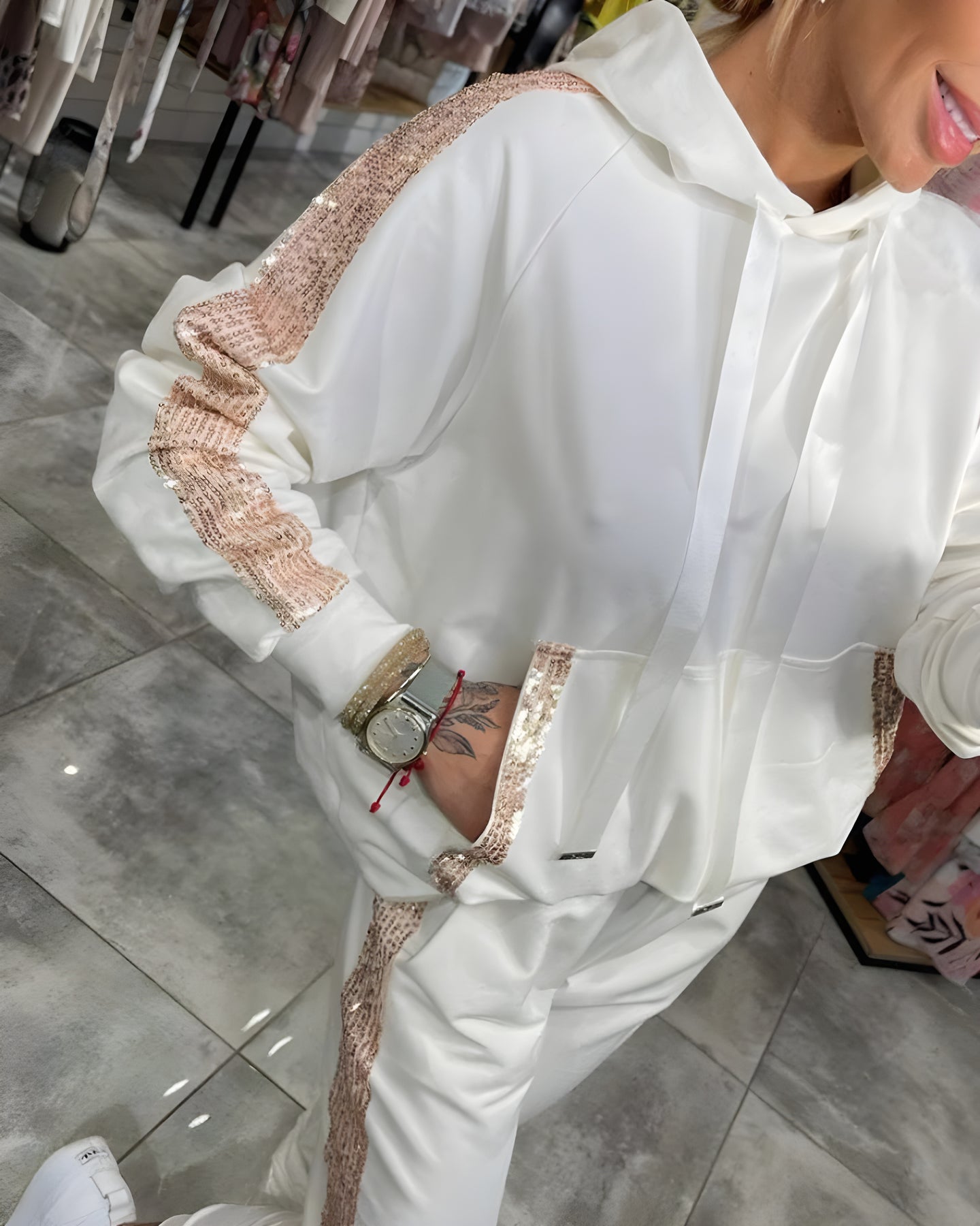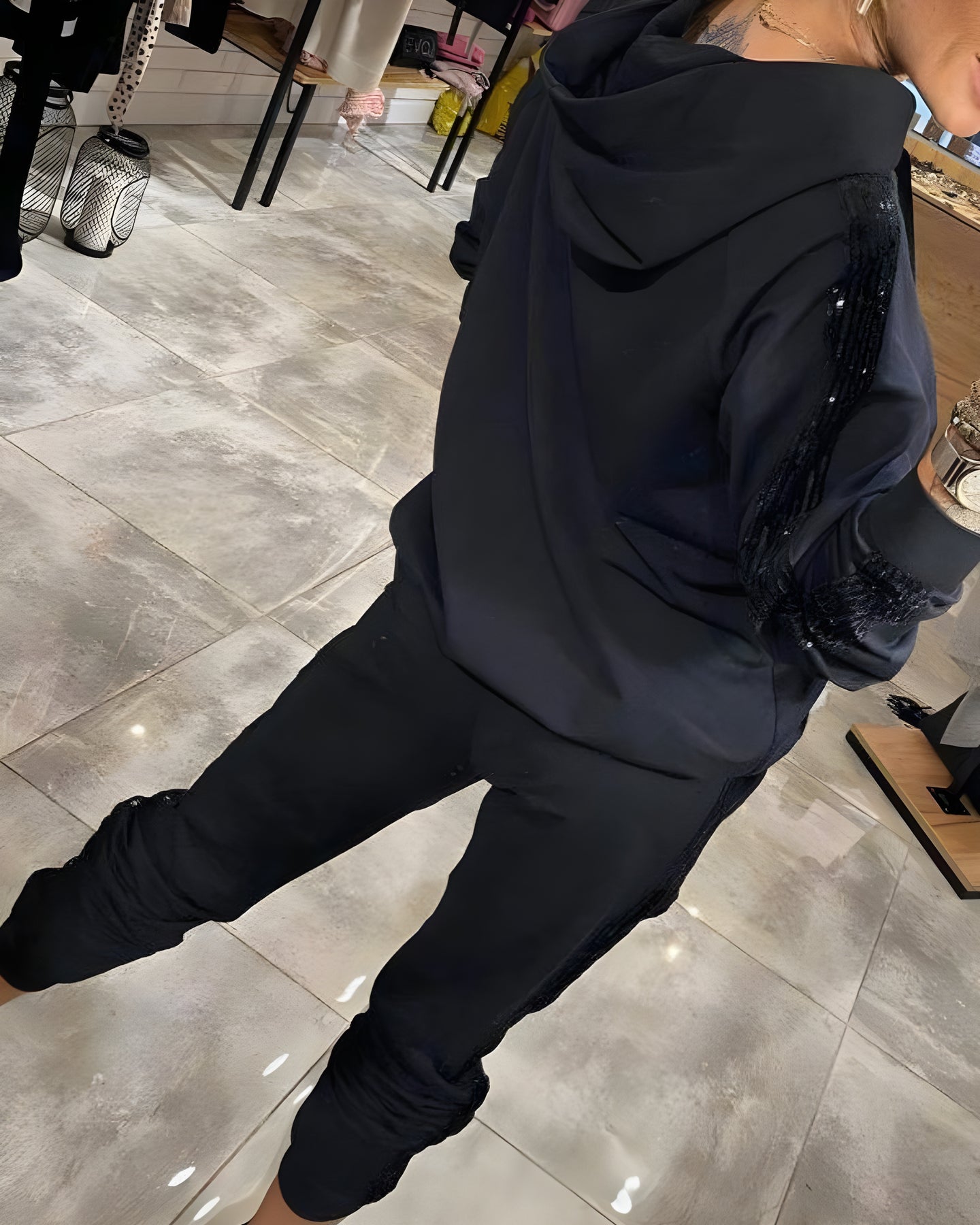 Le tissu fluide et respirant épouse le corps avec légèreté, tandis que les détails scintillants sur les manches et le pantalon apportent une brillance discrète à ton quotidien.